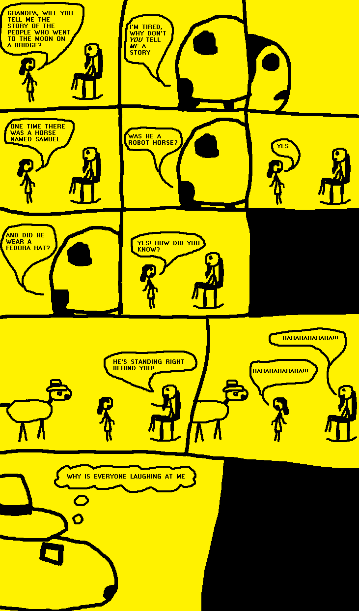 yaaaaaaay I'm listening to The Strokes This news post isn't late Do you know what time it is? Time for fan art 8:52PM The first fan art is by Darkmoogle, and is called Woman. It is a fan art about the meaningless thrills in our lives. It makes me sad/laugh The next is by Dely Apple, Staring Contest. I like how the flower winks at me at the end. He might wink to you guys too, if you Third is Yelloo by Matt aka SamuraiSloth. This one is really funny. In the last frame he says just kidding but his face just melted even more. Do you get it The fourth is Devoted Fan by Goatface. The drums look like hamburgers kinda, but they're not hamburgers. The devoted fan doesn't even like them, haha! Three more, it's a countdown. Number 3 is Bizarro by the critically acclaimed Spectre-X. I'm not sure half of what is happening, except that it is kinda creepy, might even say... Bizarre? Bizarro?? Number 2 is Lurminious' Too Sad. I think it has a moral, what is up with that little dude ;o ONE, Linearhelix's Medicine. I like the anime stuff, it seems funny on Super Mega people. I like how the last frame isn't really even trying to be a punchline, but that makes it funny. And the face makes it funny. ZERO BOOM -JohnnySmash Contact: JohnnySmash AT gmail DOT com